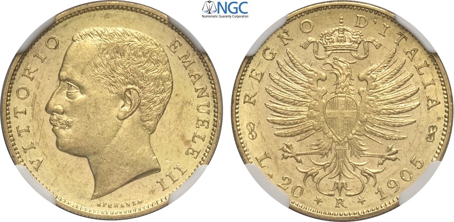 Regno d'Italia, Vittorio Emanuele III (1900-1943), 20 Lire 1905, Rara Au 21 mm 6,45 g, di ottima qualità, in Slab NGC MS63