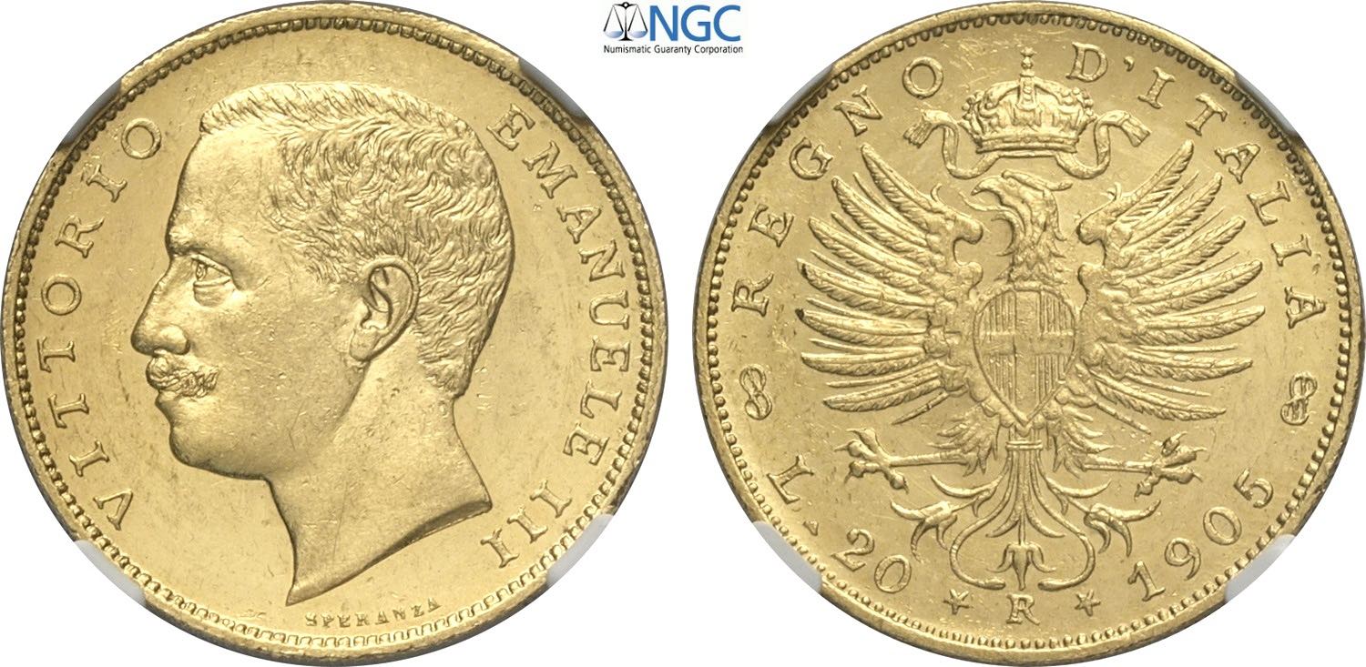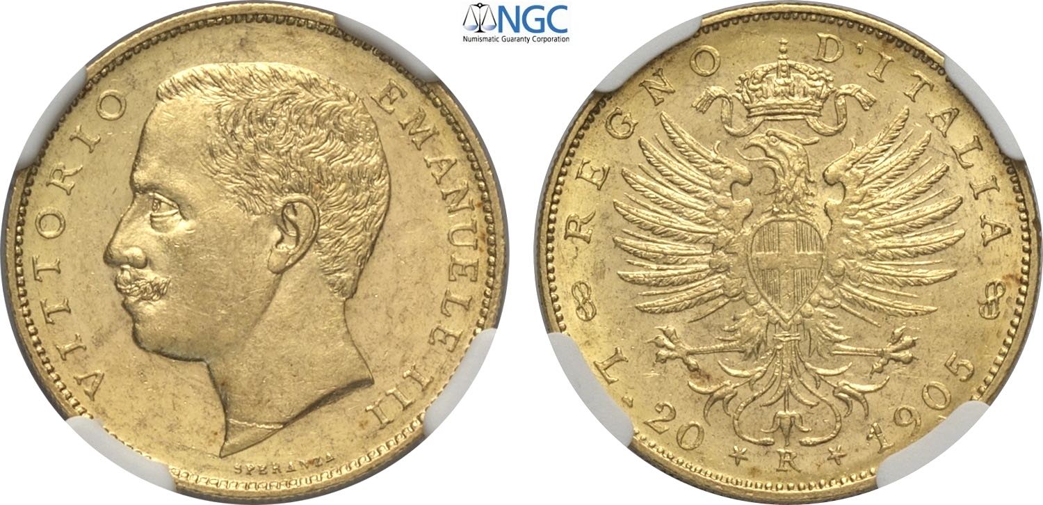 Regno d'Italia, Vittorio Emanuele III (1900-1943), 20 Lire 1905, Rara Au 21 mm 6,45 g, in Slab NGC MS62
