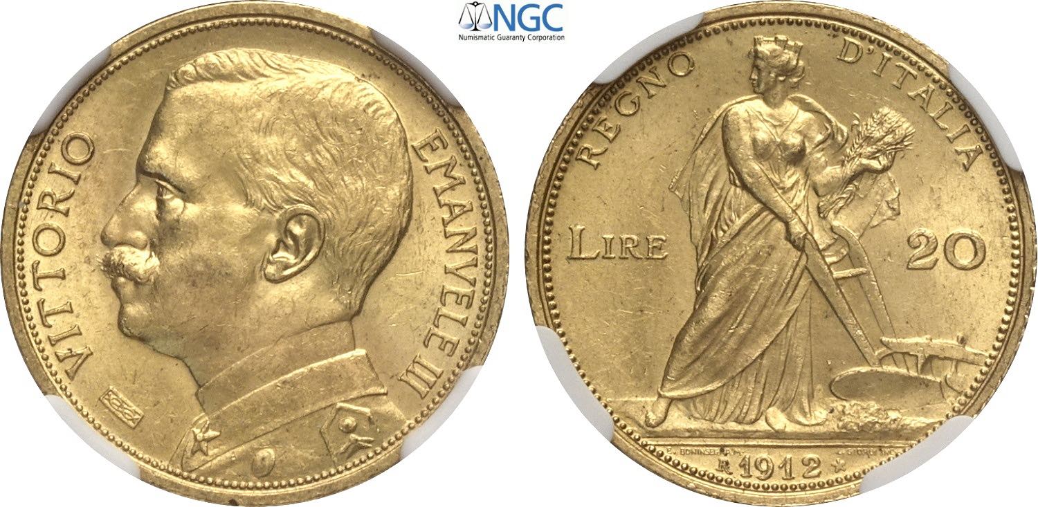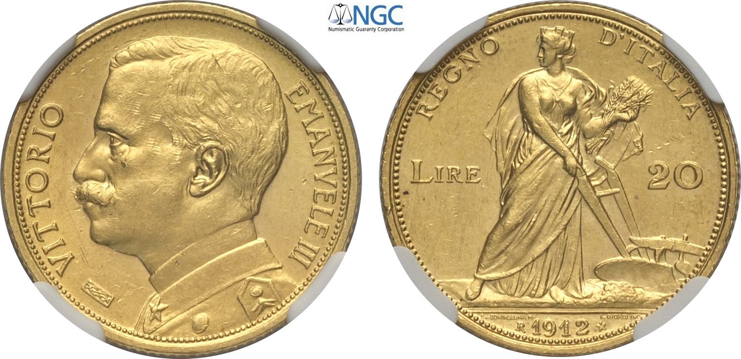 Regno d'Italia, Vittorio Emanuele III (1900-1943), 20 Lire 1912, Rara Au 21 mm 6,45 g, in Slab NGC MS62