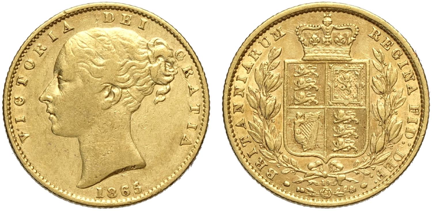 Great Britain, Victoria (1837-1901), Shiled Sovereign 1865 die number 19, Au mm 22 BB