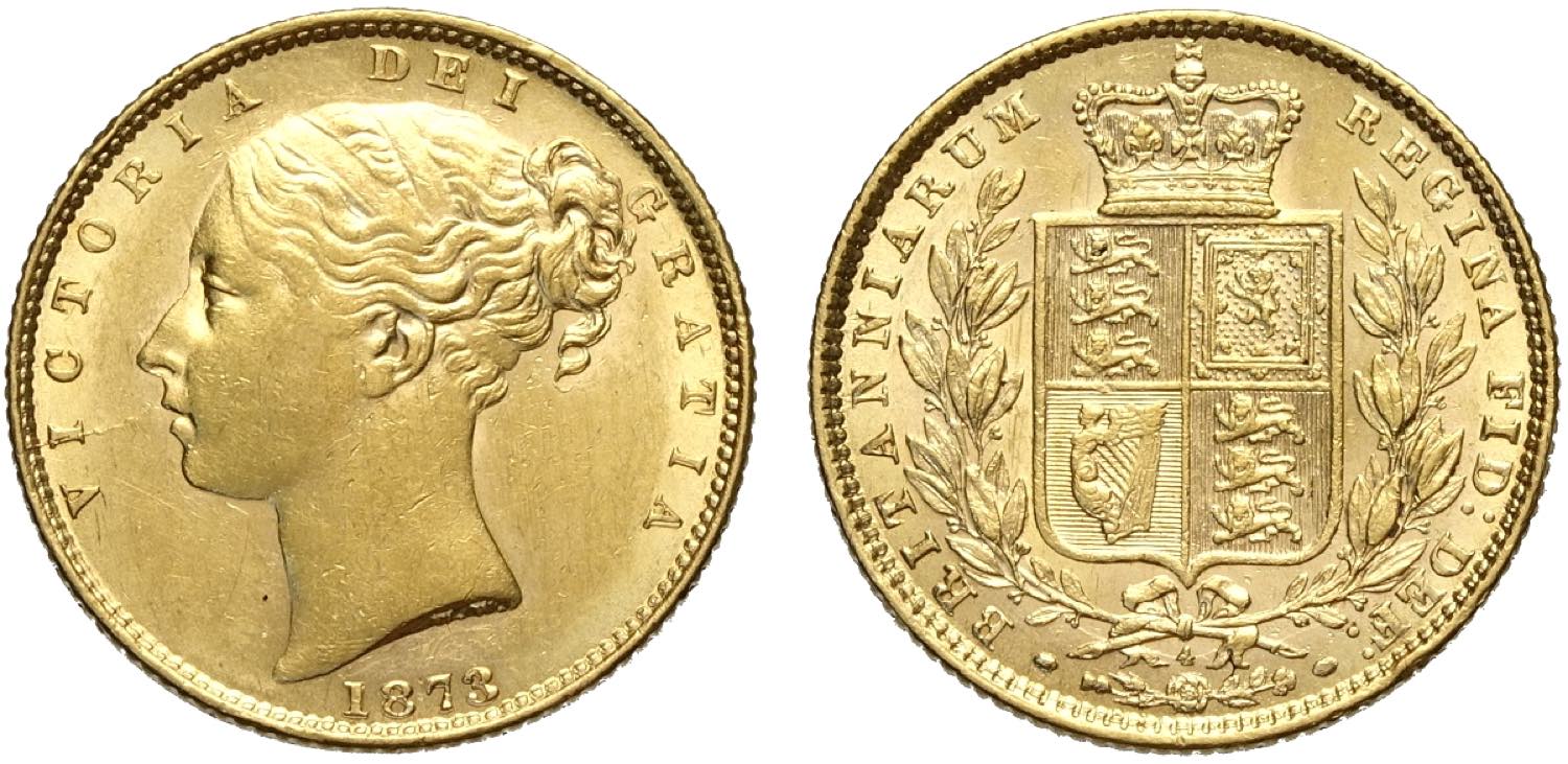 Great Britain, Victoria (1837-1901), Shiled Sovereign 1873 die number 4, Au mm 22 SPL