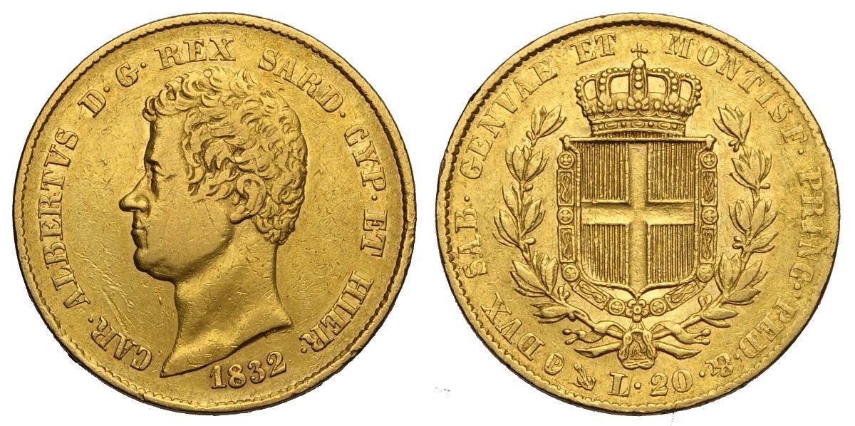 Savoia, Carlo Alberto, 20 Lire 1832 Genova C/FERT, Au mm 21 MB-BB