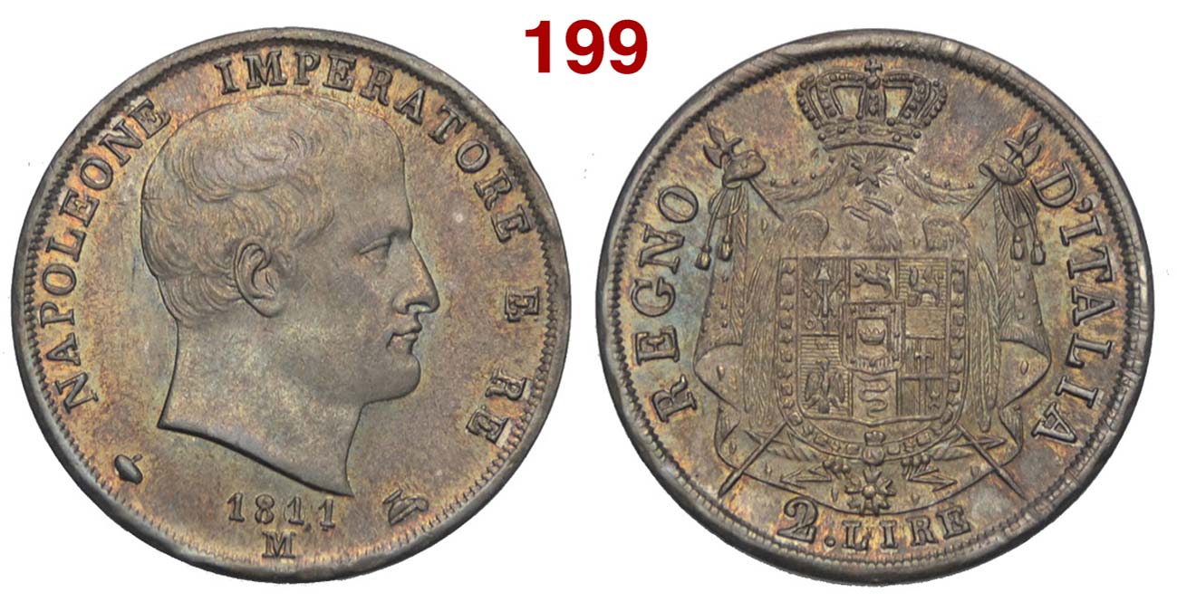 Milano - Napoleone I - 2 Lire 1811 puntali aguzzi - AG mm 28 g. 9,99 - bella patina iridescente, migliore al rovescio, nel complesso SPL