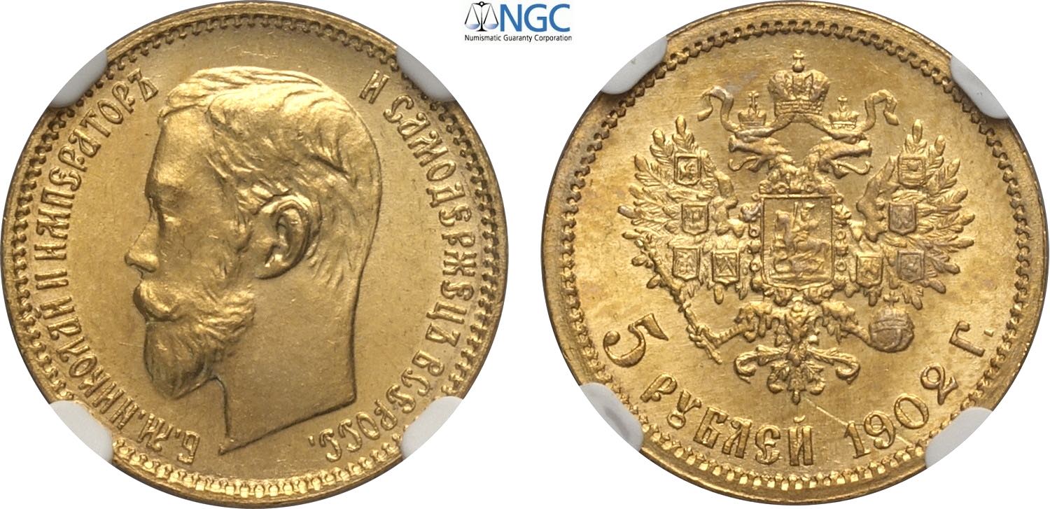 Russia, Nicholas II (1894-1917), 5 Roubles 1902, Au 18,5 mm 4,30 g, in Slab NGC MS64