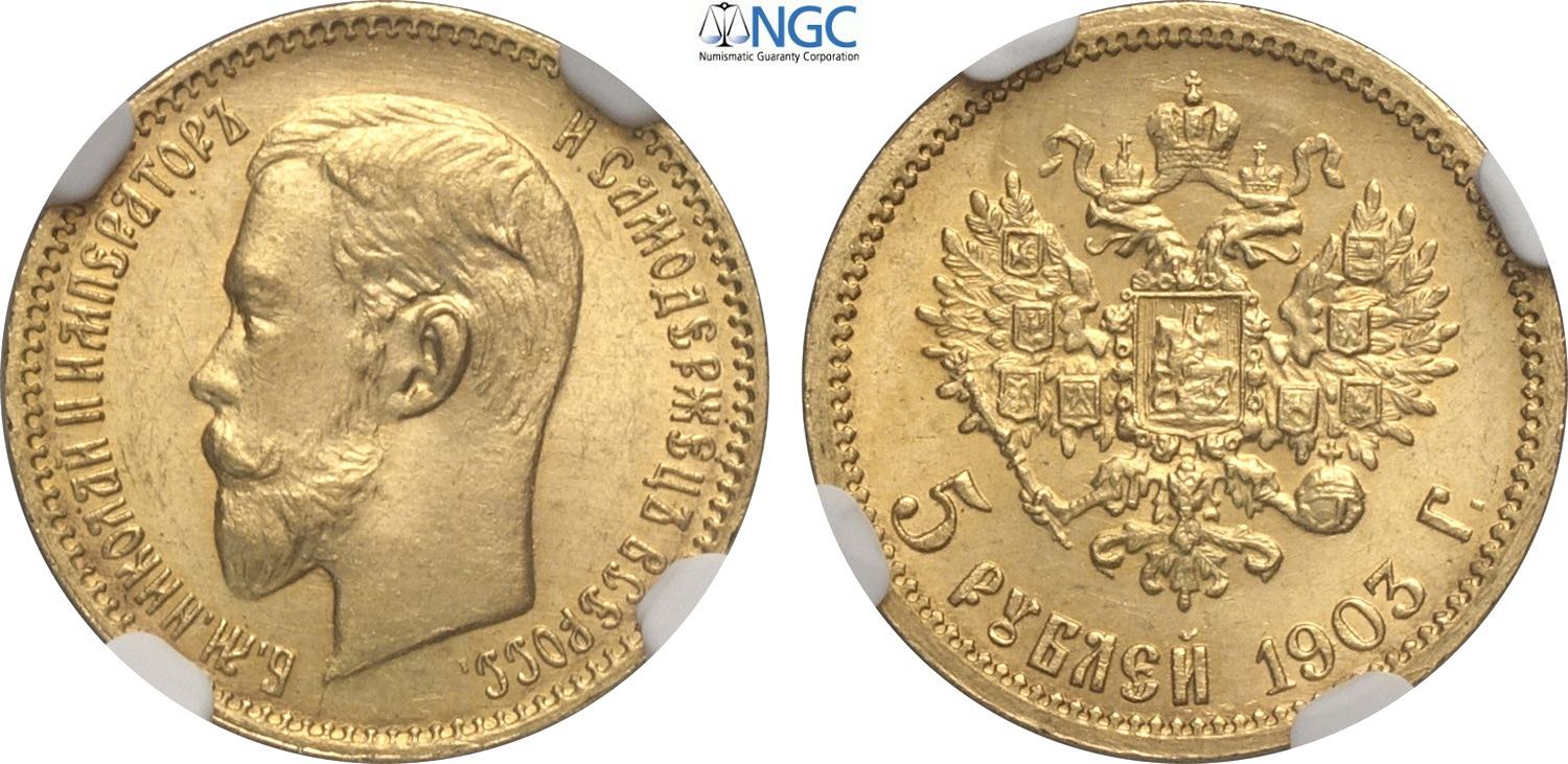 Russia, Nicholas II (1894-1917), 5 Roubles 1903, Au 18,5 mm 4,30 g, in Slab NGC MS64