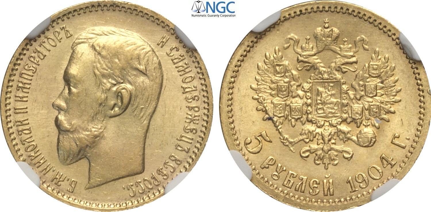 Russia, Nicholas II (1894-1917), 5 Roubles 1904, Au 18,5 mm 4,30 g, in Slab NGC MS65
