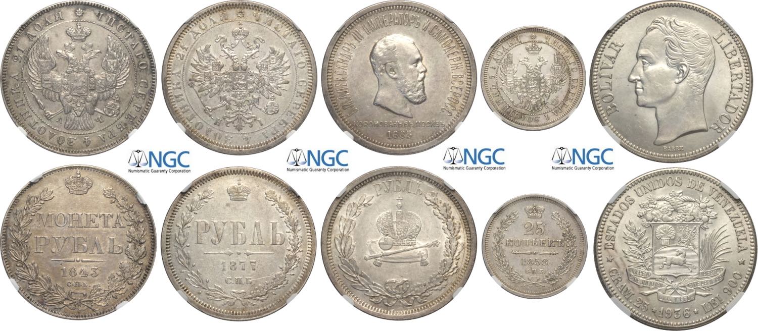 Russia and Venezuela, Lot of 5 coins in Slab NGC: Rouble 1843 (UNC-obv cleaned), Rouble 1877 (AU-rev scratched), Rouble 1883 (UNC-rev ...