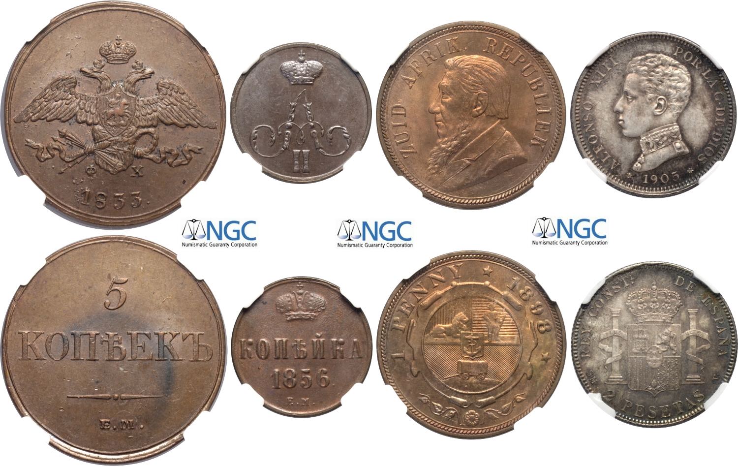 Russia, South Africa and Spain, Lot of 4 coins in Slab NGC: 5 Kopeks 1833 (MS63 BN), Kopek 1856 (MS64 BN), Penny 1898 (MS65 RB), 2 Pesetas ...