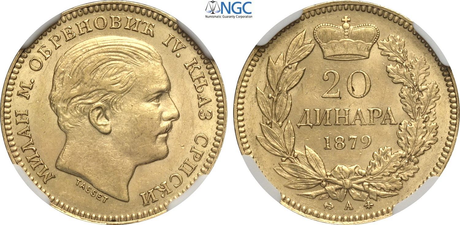 Serbia, Milan Obrenovich IV (1868-1889), 20 Dinara 1879-A, Paris mint, Au 21 mm 6,45 g, in Slab NGC MS61