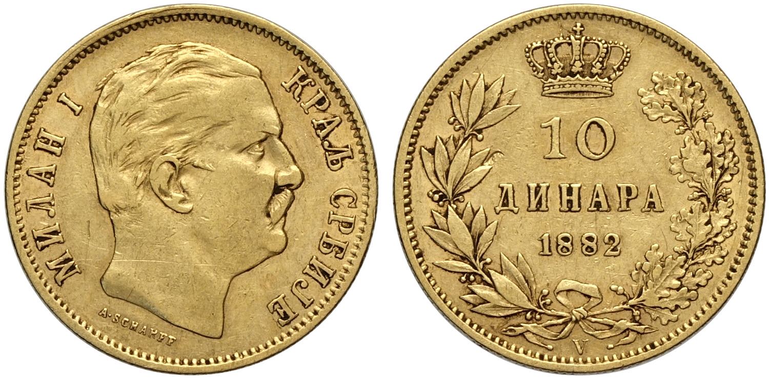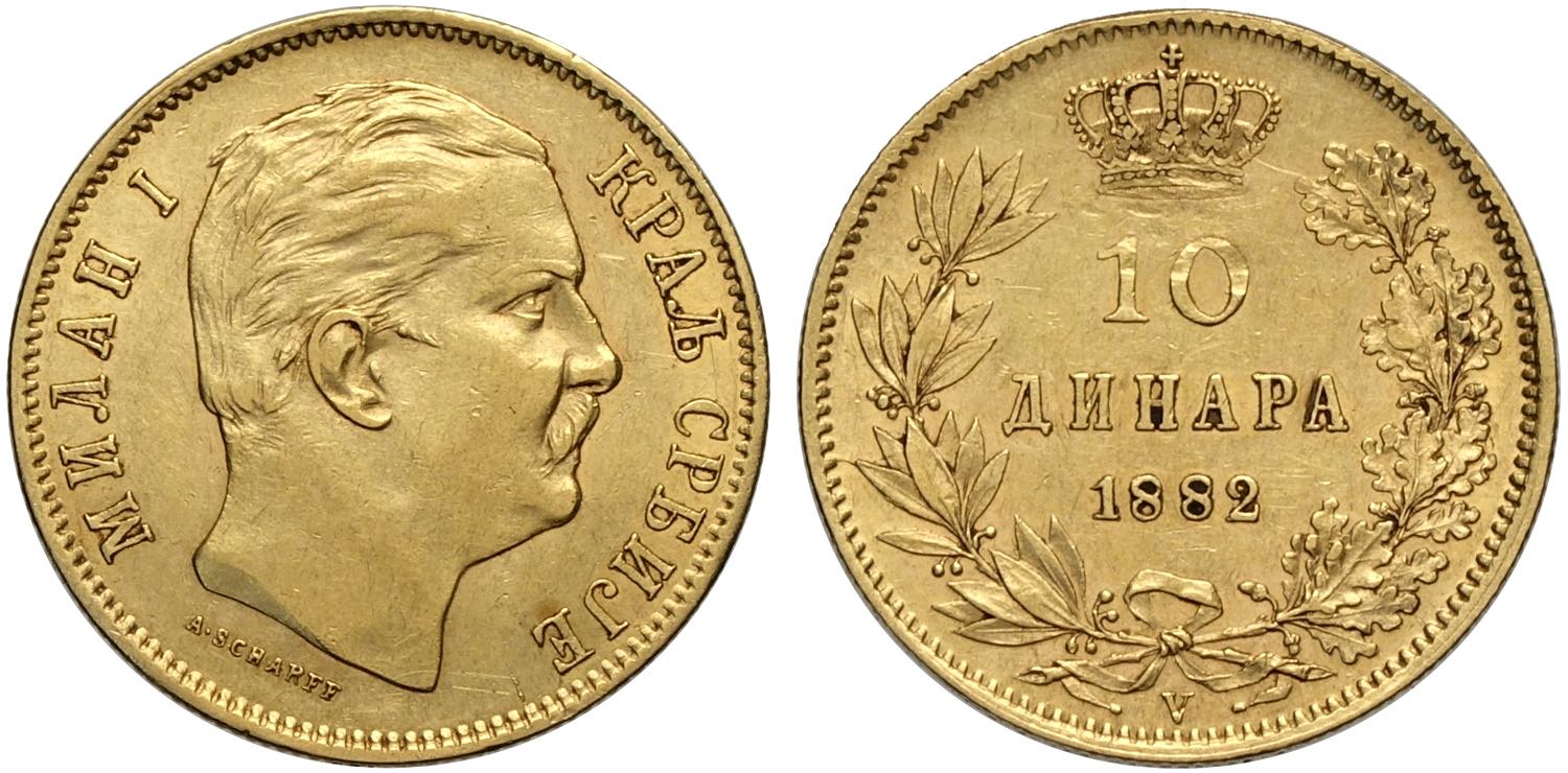Serbia, Milan Obrenovich IV (1868-1889), 10 Dinara 1882-V, Vienna mint, Au 19 mm 3,22 g, BB-SPL