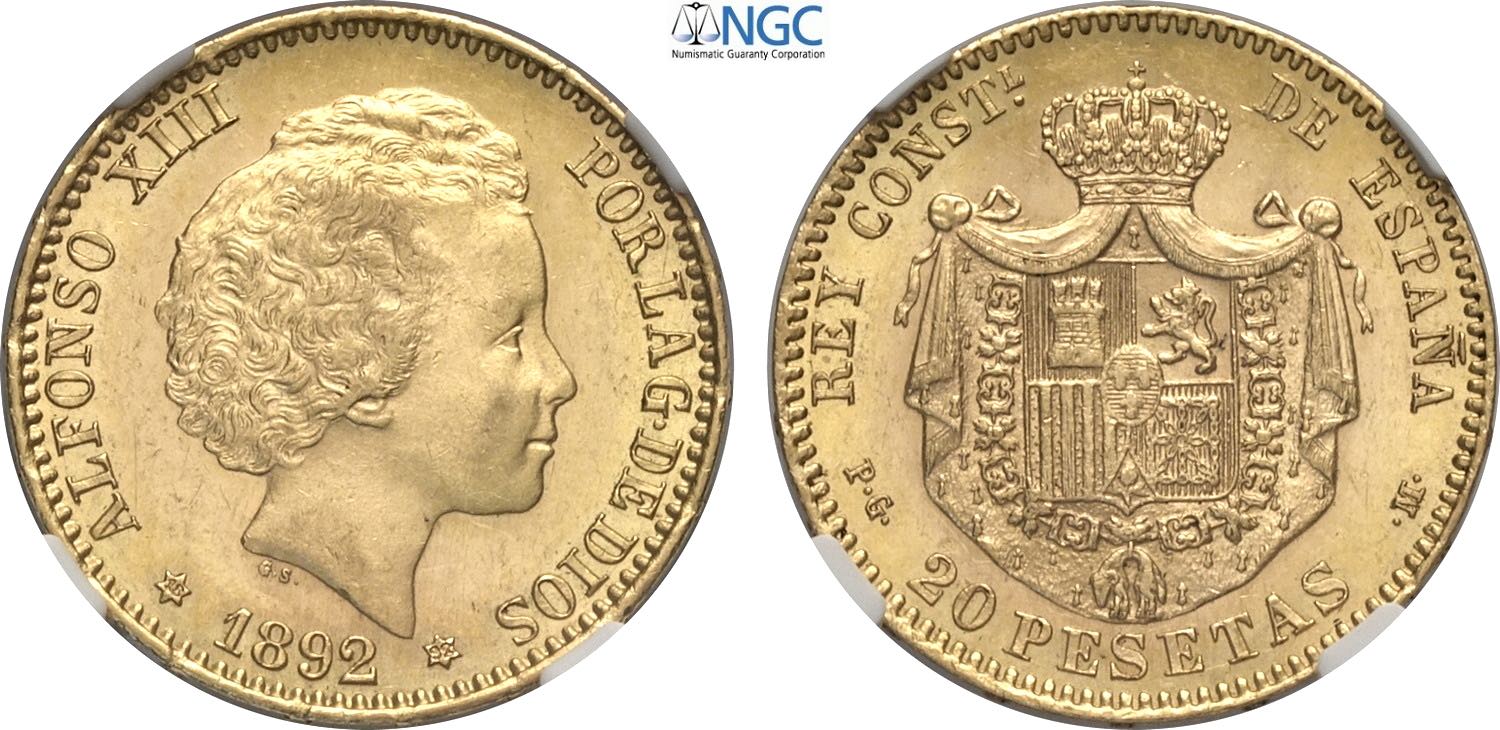 Spain, Alfonso XIII (1886-1931), 20 Pesetas 1892 (92), Au 21 mm 6,45 g, in Slab NGC MS62