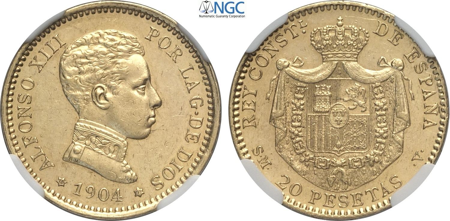 Spain, Alfonso XIII (1886-1931), 20 Pesetas 1904 (04), mintage: 3815, Rare Au 21 mm 6,45 g, di qualitร inusuale per questa emissione, in ...