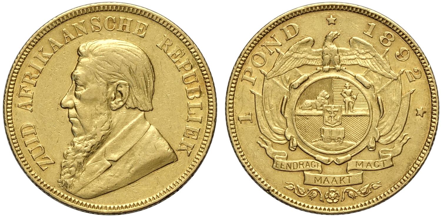 South Africa, First Republic (1860-1902), Pond (Sovereign) 1892 single shaft wagon tongue, Au 22 mm 7,99 g, BB+