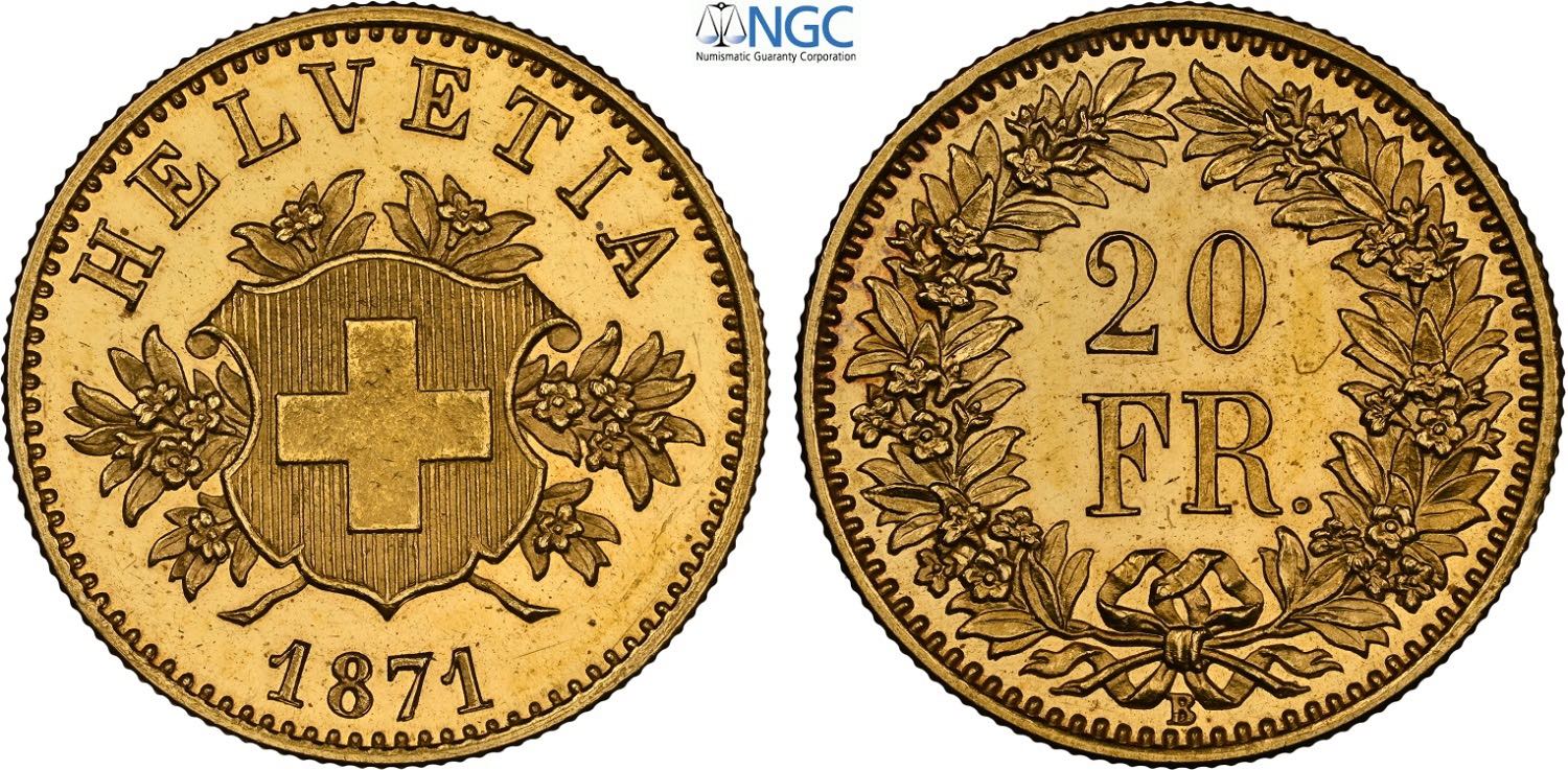 Switzerland, Federal State (1848-), Gold Pattern 20 Francs 1871, RRRR Varesi-634 KM-Pn17 HMZ-1225, Au 21 mm 6,45 g. In Slab NGC PF63 Cameo