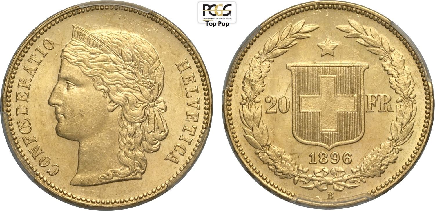Switzerland, Federal State (1848-), 20 Francs 1896, Au 21 mm 6,45 g. Di conservazione eccezionale, In Slab PCGS MS65 Top Pop! (cert. ...