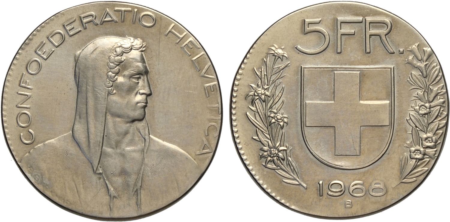Switzerland, Federal State (1848-), 5 Francs 1968 minted on the 2 francs flan, RRR HMZ-1337, mintage: estimated 20, Ni 27,4 mm 10,16 g, ...