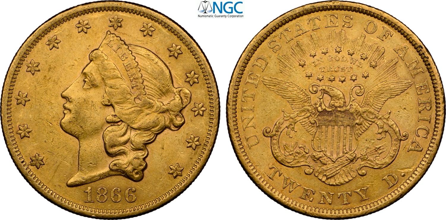 United States of America, Federal Republic (1776-), 20 Dollars 1866 Motto, Philadelphia mint, Au 34 mm 33,43 g, in Slab NGC AU55