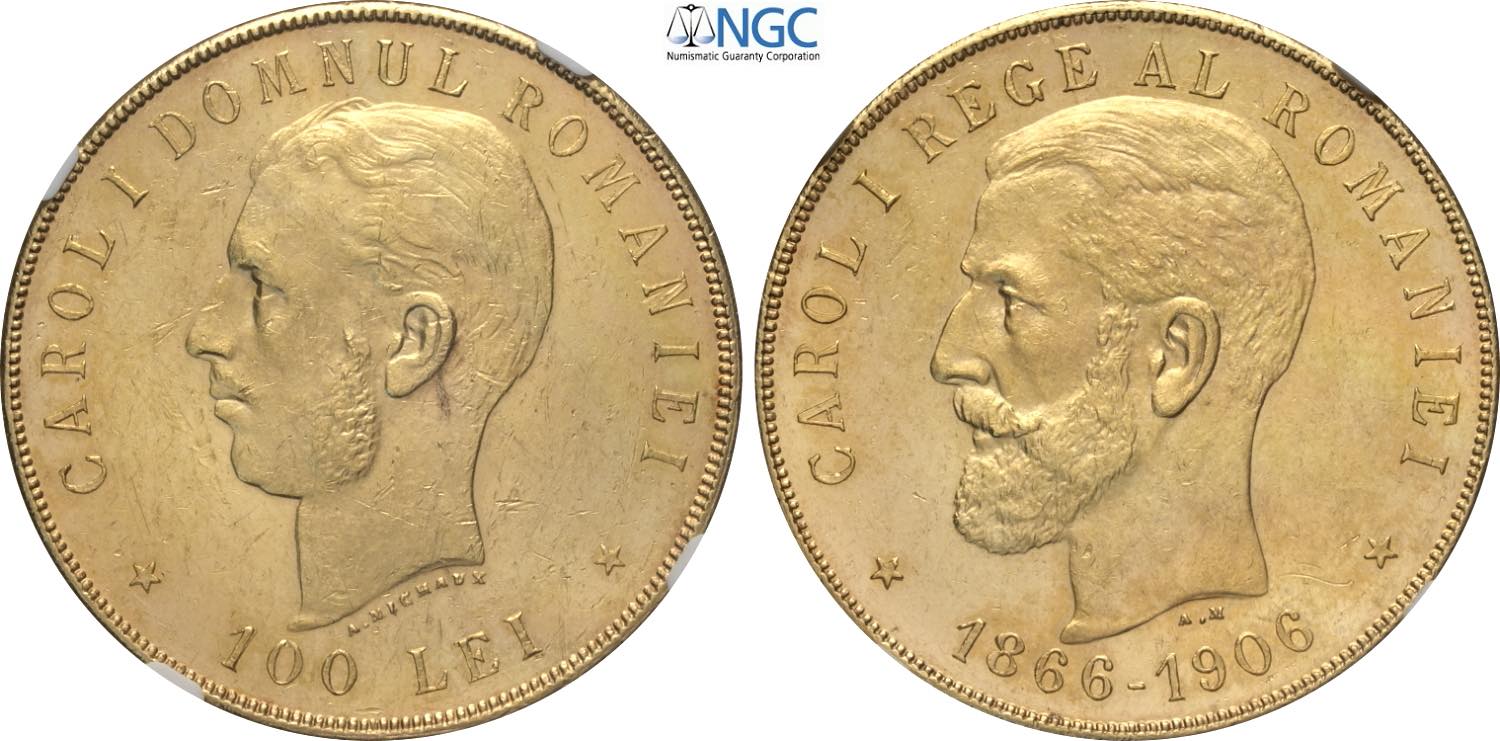 Romania, Carol I (1866-1914), 100 Lei 1906, Bruxelles, Au 36 mm 32,26 g, in Slab NGC MS61