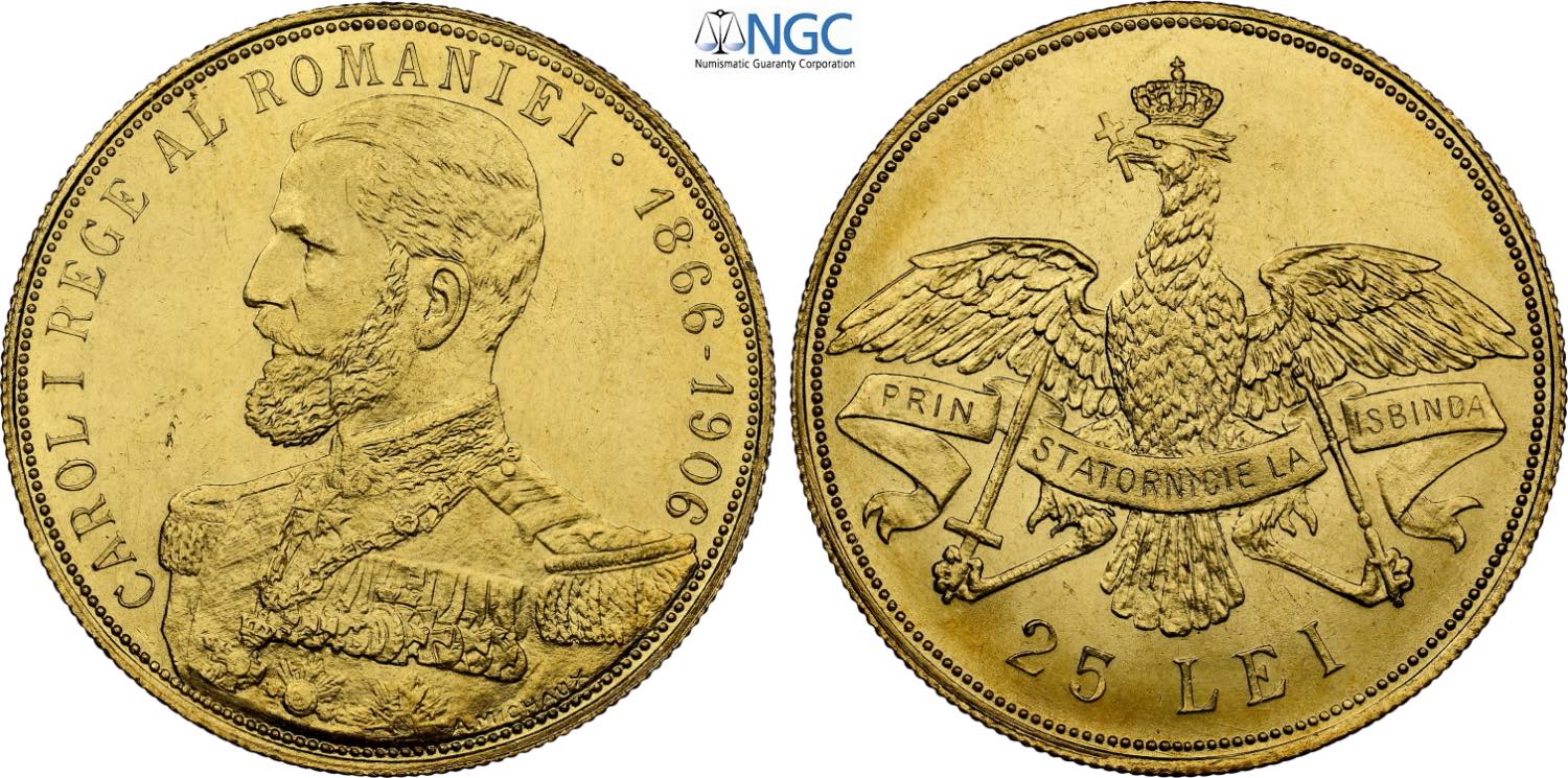 Romania, Carol I (1866-1914), 25 Lei 1906, Bruxelles, Au 30 mm 8,06 g, eccezionale per il tipo, in Slab NGC MS64 (only 2 coins is graded ...