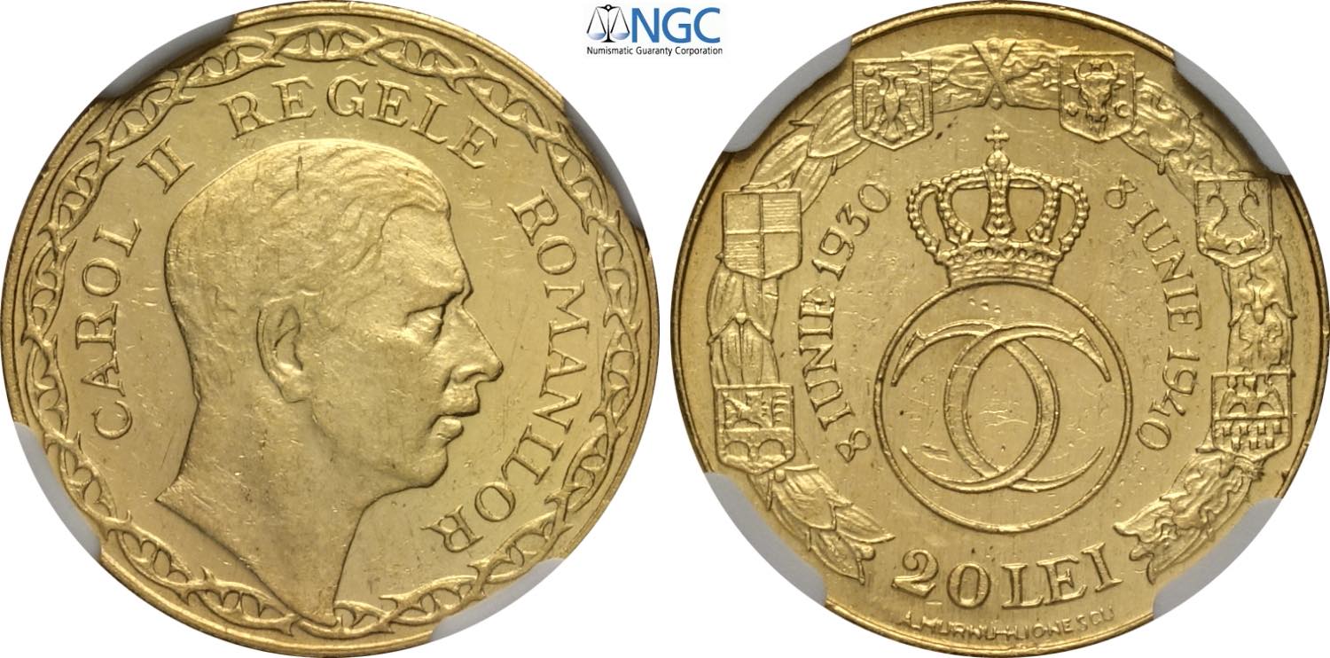 Romania, Carol II (1930-1940), 20 Lei 1940 anniversary of reign, Bucharest mint, mintage: 500, Au 21 mm, 6,5 g, in Slab NGC MS61