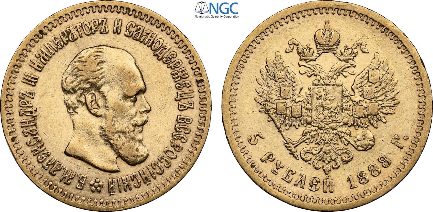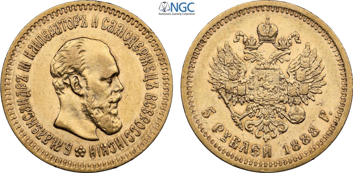 Russia, Alexander III (1881-1894), 5 Roubles 1888, Au 21,3 mm, 6,45 g, in Slab NGC AU58