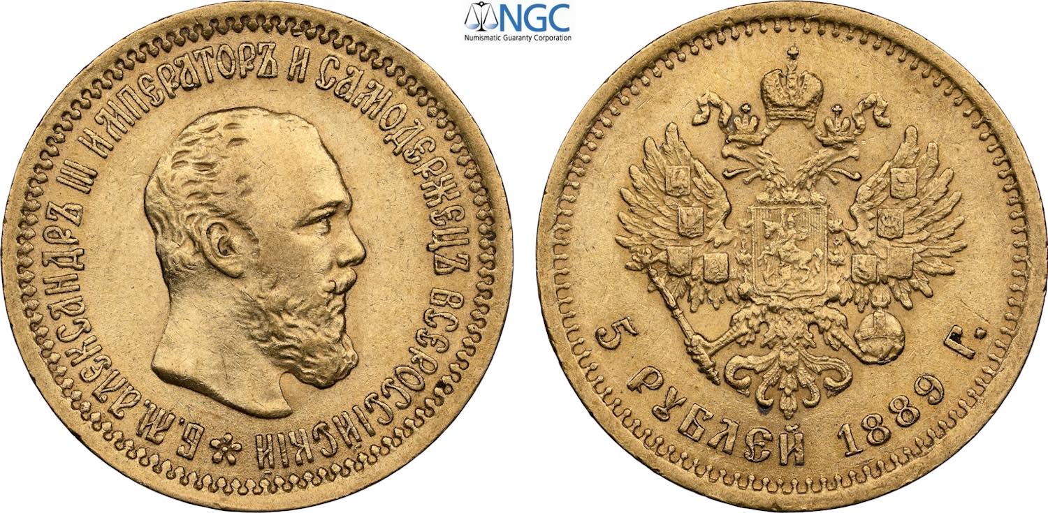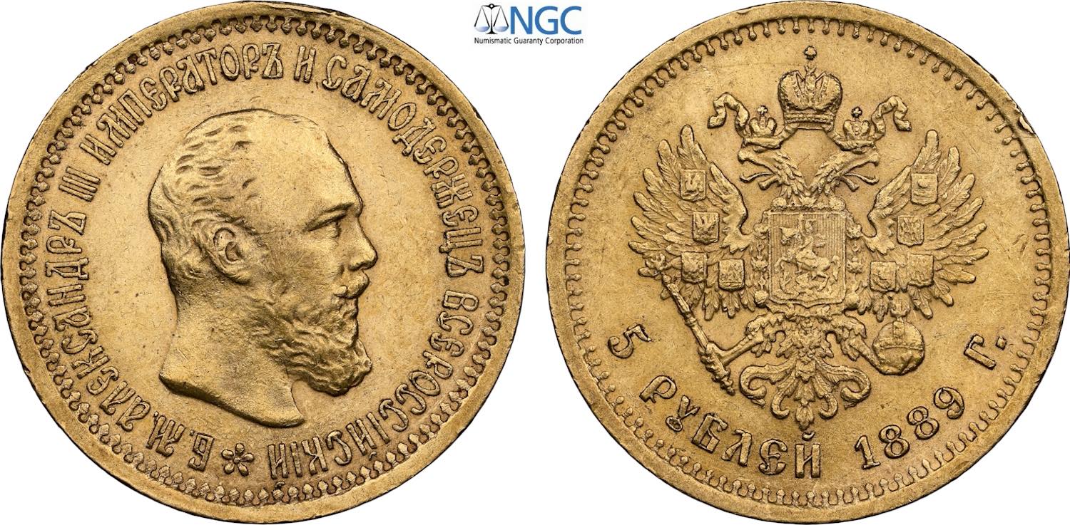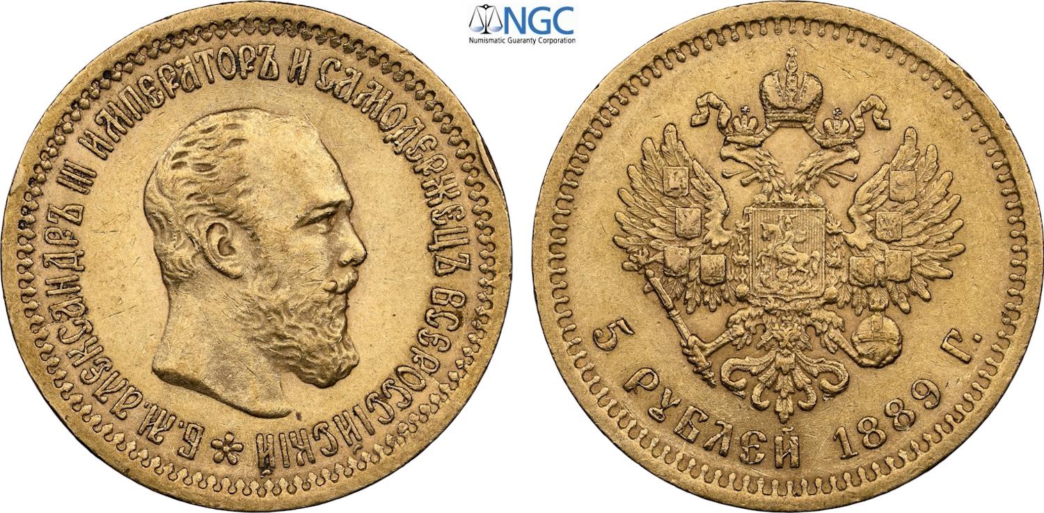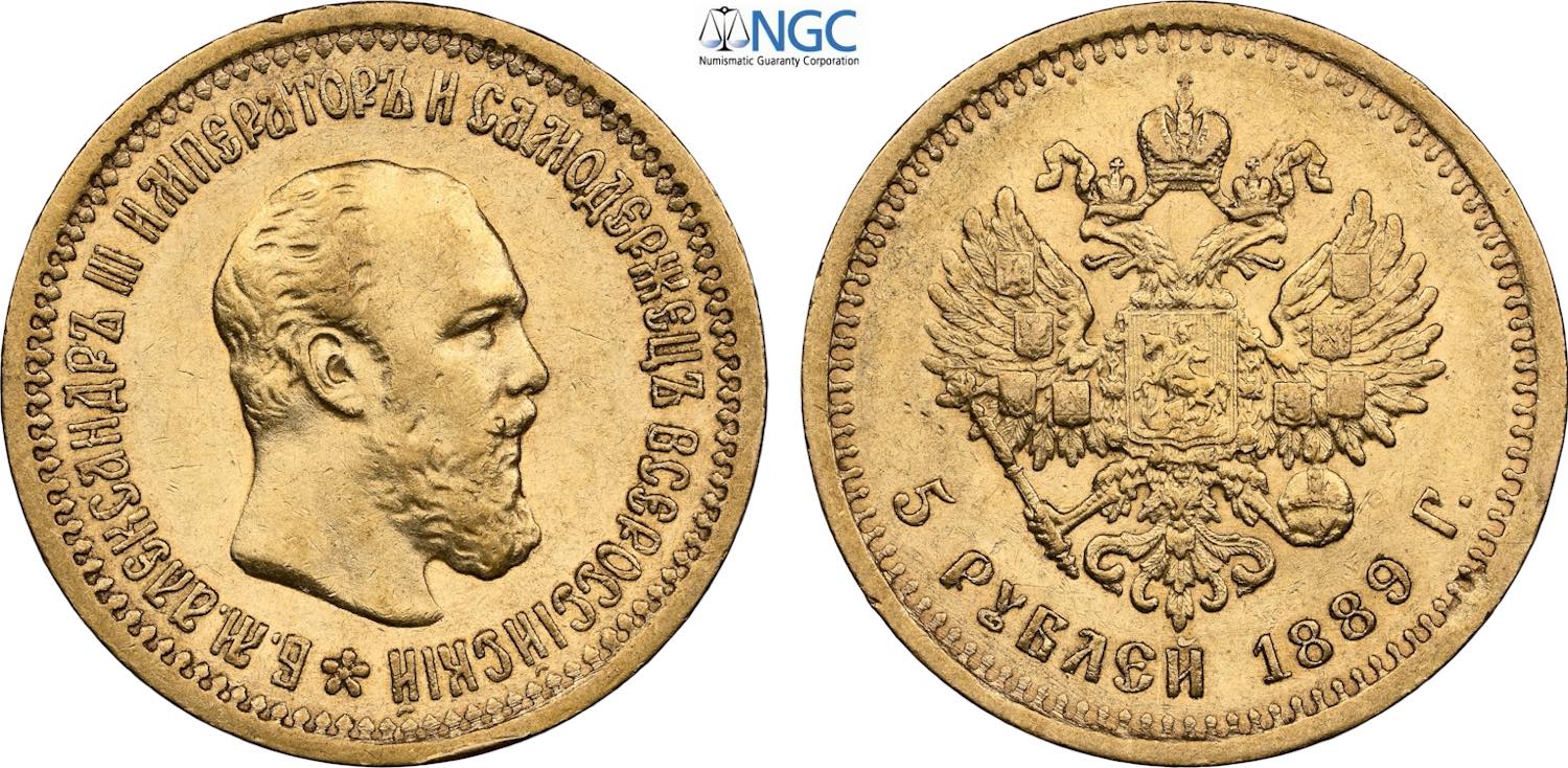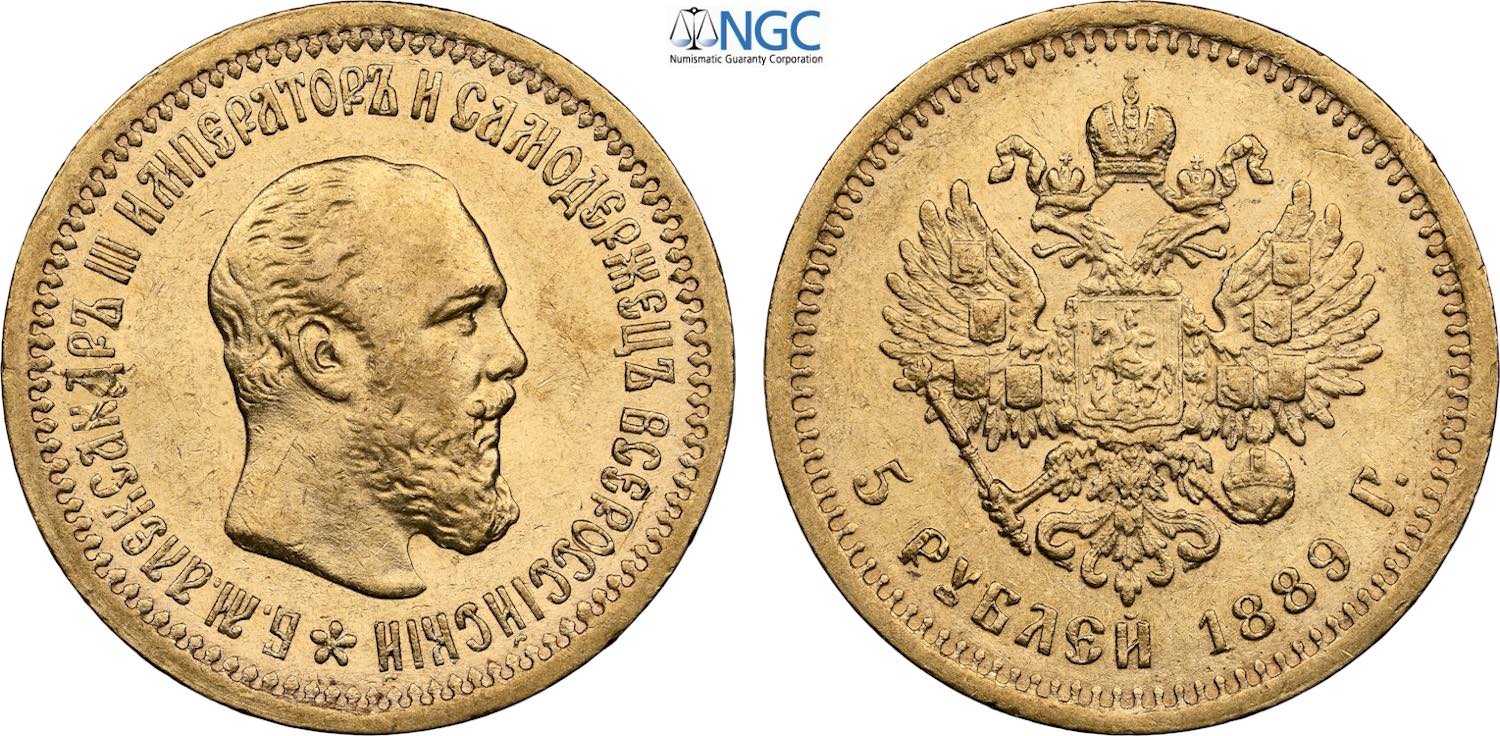 Russia, Alexander III (1881-1894), 5 Roubles 1889, Bit-33, Au 21,3 mm, 6,45 g, in Slab NGC AU53