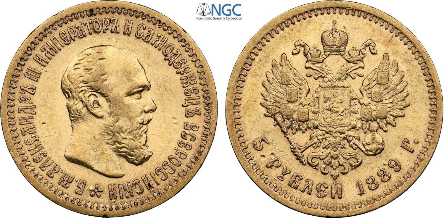 Russia, Alexander III (1881-1894), 5 Roubles 1889, Bit-33, Au 21,3 mm, 6,45 g, in Slab NGC MS61