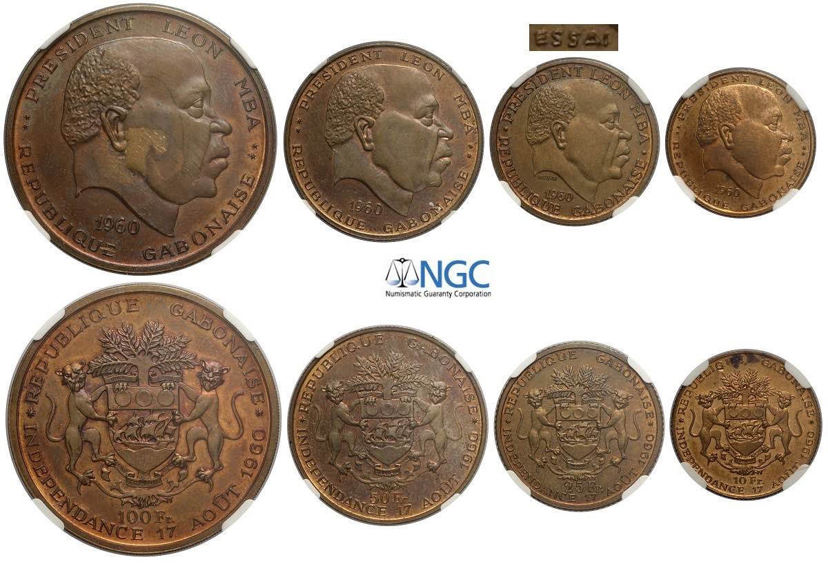Gabon, Republic, Copper Pattern Proof Set 1960 (4), KM unlisted, mm 36, 26, 22, 19, In slab NGC: 100 Francs PF64, 50 Francs PF65, 25 Francs ...