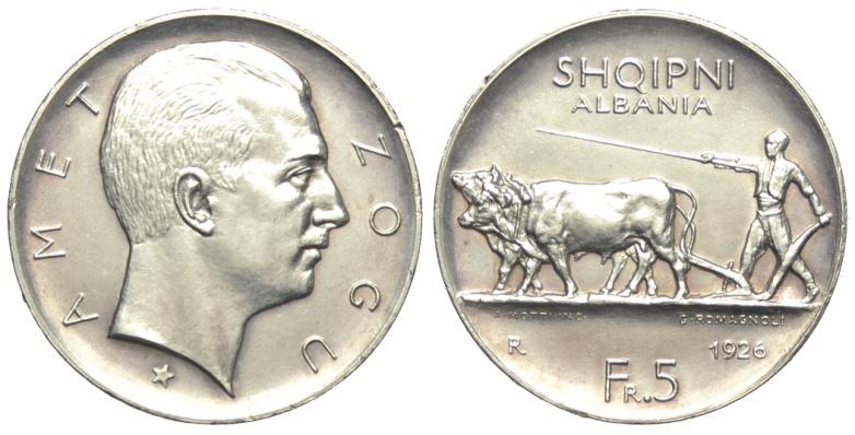 Albania 5 Franchi 1926 - Albania – Amet Zogu (1925-1939)5 Franchi 1926 con stella sotto il collo – AG mm 37leggermente pulita e due ...