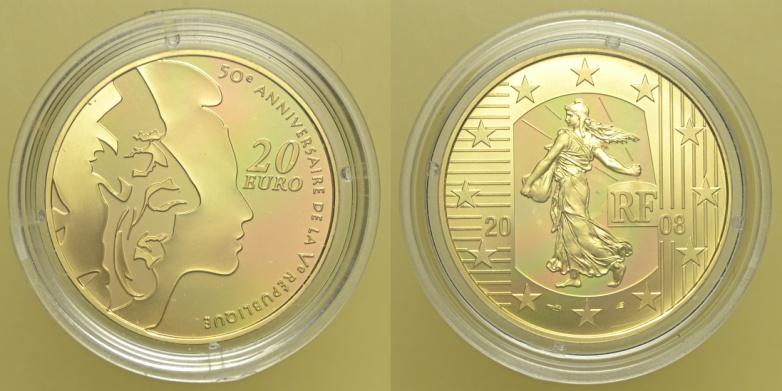 Francia 20 Euro 2008 - Francia – Quinta Repubblica (dal 1959)20 Euro 2008 “50 Anni di Repubblica” - AU 920/1000 mm 31 g. 17 – con ...
