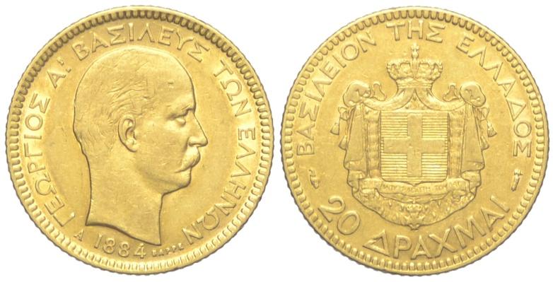 Grecia 20 Dracme 1884 - Grecia – Giorgio I (1863-1913)20 Dracme 1884 – Non Comune AU mm 21 BB+