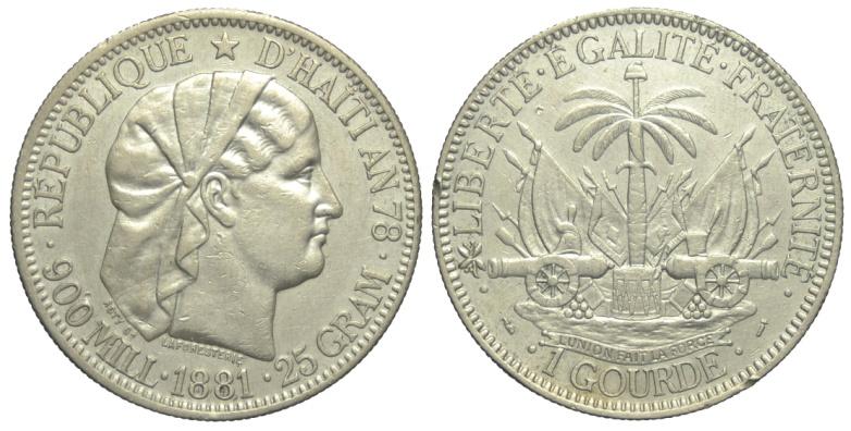 Haiti Gourde 1881 - Haiti – RepubblicaGourde 1881 – AG mm 37,3 tracce di pulizia e colpetti altrimenti BB