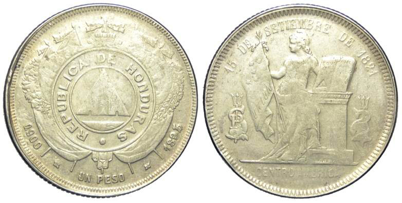 Honduras Peso 1895 - Honduras – RepubblicaPeso 1895 – AG mm 38Lievi restauri sul taglio altrimenti BB