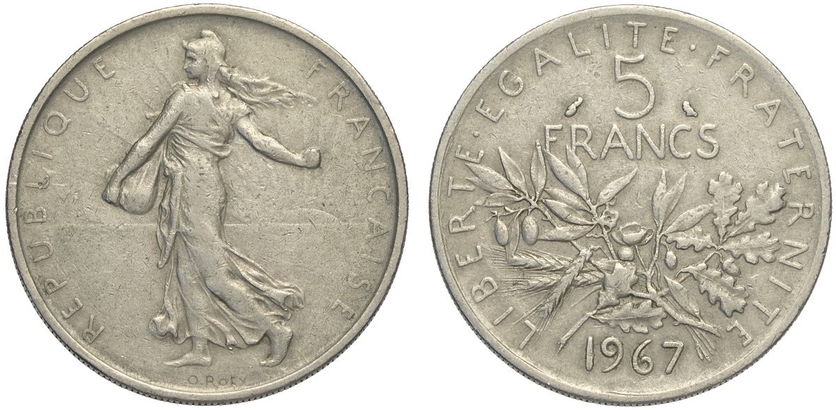 France, Fifth Republic (1959-), 5 Francs 1967 Nickel, Rara Ni mm 29 g 10,46 BB