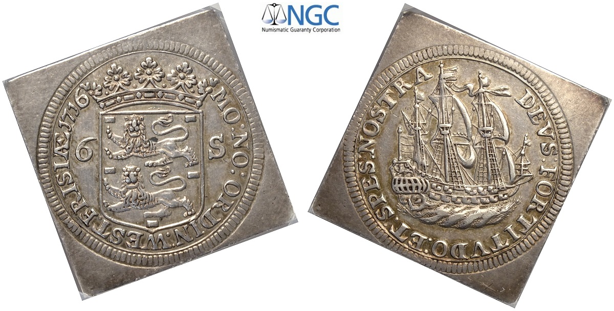 Netherlands, West Friesland (Frisia), 6 Stuivers (Scheepjesschelling) 1716 Klippe, Rare KM-110 Ag 27x27 mm 6,41 g , in Slab NGC AU58 (cert. ...