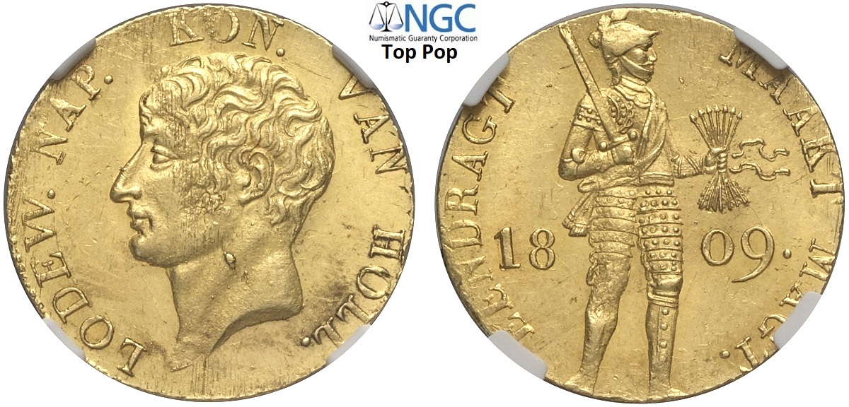 Netherlands, Louis Napoleon (1806-1810), Ducat 1809 knight standing, Au 19 mm , exceptional conservation, in Slab NGC MS65 Top Pop! (cert. ...