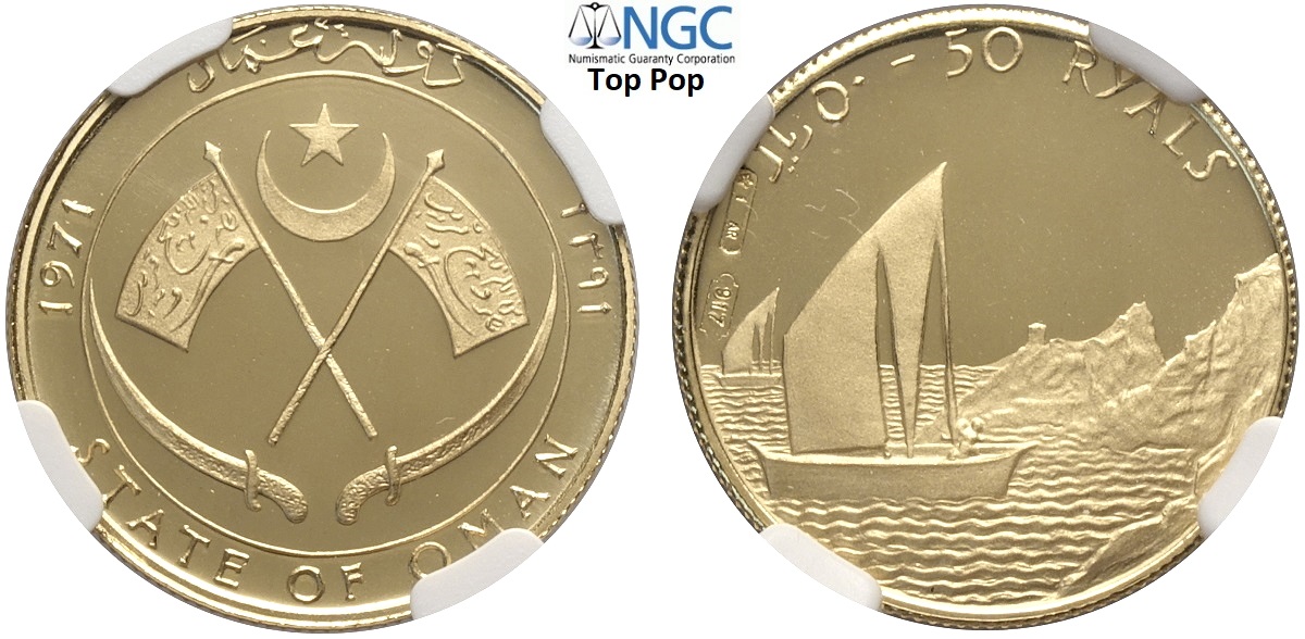 Oman, Ghalib ibn Ali (1959-2009), 50 Ryals (1/2 Pound) 1971, Au 917/1000, 20 mm 4,00 g in Slab NGC PF69 Ultra Cameo, Top Pop!