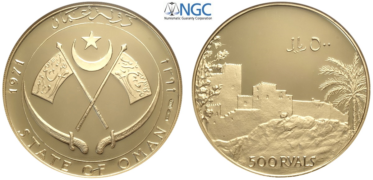 Oman, Ghalib ibn Ali (1959-2009), 500 Ryals (5 Pounds) 1971, Au 917/1000, 45 mm 40,00 g in Slab NGC PF68 Ultra Cameo