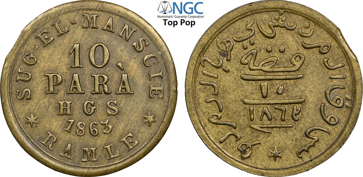 Palestine, Al-Ramla, 10 Para 1863, Lec-46A Brass 21 mm , of particular quality for this type, in Slab NGC MS62 Top Pop! (cert. 6641481015)