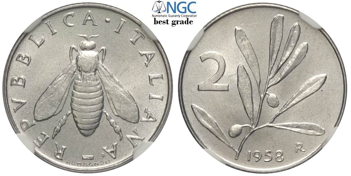 Repubblica Italiana, Monetazione in Lire, 2 Lire 1958, RR Al mm 18,3 conservazione eccezionale, in Slab NGC MS67 (miglior esemplare sigillato NGC)