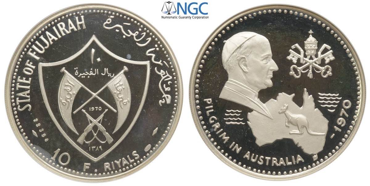 Fujairah, United Arab Emirates, 10 Riyals 1970 "Pilgrim in Australia" Proof, Ag mm 45 in Slab NGC PF67