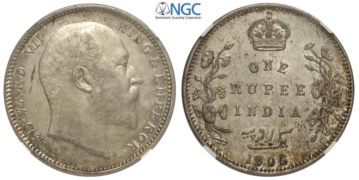 India-British, Edward VII, Rupee 1905-B Bombay, Ag mm 30 in Slab NGC MS63