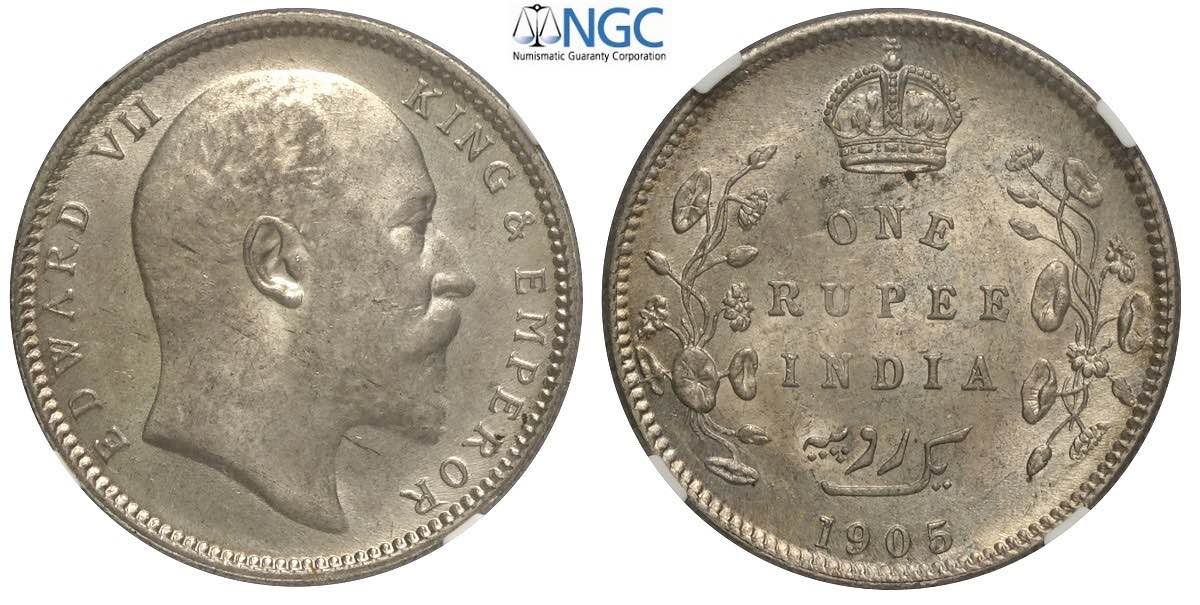 India-British, Edward VII, Rupee 1905 (c) Calcutta, Ag mm 30 in Slab NGC MS63
