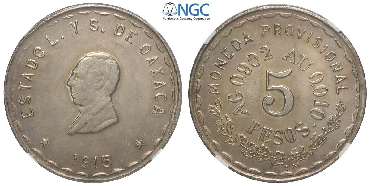 Mexico Oaxaca, 5 Pesos 1915 silver, 2 below P, Ag mm 30 in Slab NGC MS62