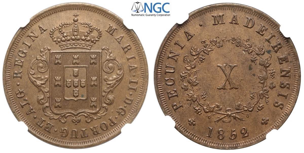 Lot 397 - Portugal, Maria II, 10 Reis 1852, Cu mm 33 in Slab NGC MS63 ...