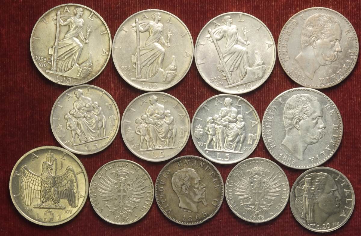 Regno d'Italia, Vittorio Emanuele III, Lotto di 13 monete: 10 Lire 1936 (3 pz q.SPL), 5 Lire 1936 (q.SPL), 5 Lire 1937 (2 pz BB+), Lira 1936 (q.FDC), 25 Cent 1902 (BB), 25 Cent 1903 (BB), 20 Cent 1936 (SPL-FDC), 2 Lire 1885 (2 pz BB), Lira 1863 (MB)