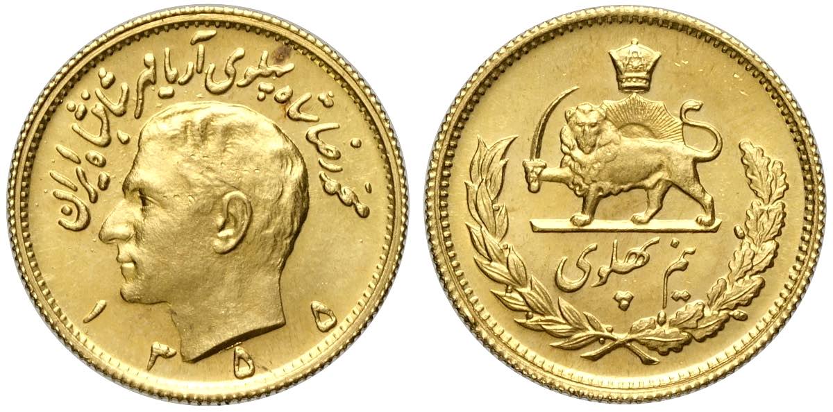Iran, Muhammad Reza Pahlavi Shah, 1/2 Pahlavi (1/2 pound) SH1355, Au 900 g 4,07 FDC