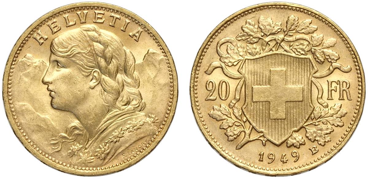 Lot 361 - Switzerland, Confederation, 20 Francs 1949, Au g 6,45 ...