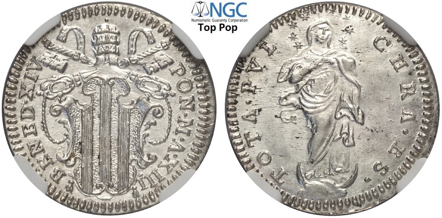 Roma, Benedetto XIV (1740-1758), Grosso anno XIII, Munt-66a Ag mm 20 in Slab NGC MS64 (Top Pop! Cert. 5790922007)