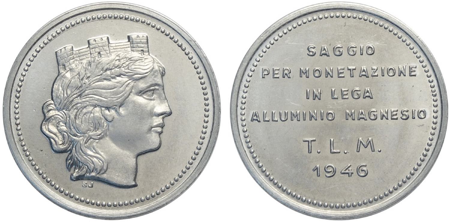 Repubblica Italiana, monetazione in Lire (1946-2001), Progetto del 2 Lire 1946, RRRR Luppino PP SJ114, Italma mm 24,1 g 1,85. Progetto presumibilmente proposto dallo Stabilimento Johnson per la monetazione della neonata Repubblica Italiana. Peso, diametro e tipo di metallo sono simili al modello poi approvato del 2 Lire "spiga". FDC